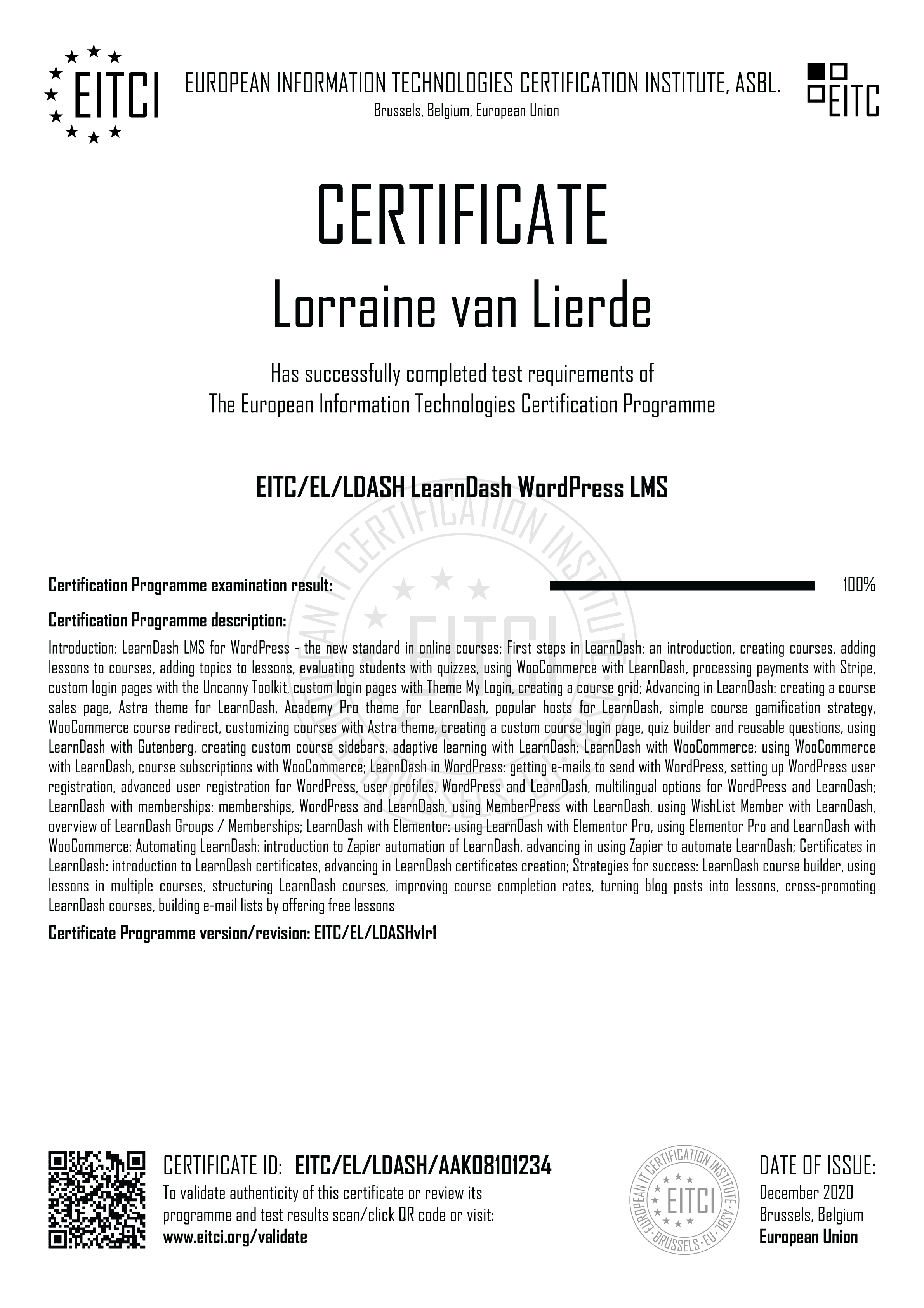 By enroling for the European Information Technologies Certification EITC/EL/LDASH LearnDash WordPress LMS you will have access to the complete didactic programme corresponding to the Certification Curriculum and the relevant examination procedure implemented fully remotely (with free additional retakes if required). Upon successful passing of the EITC/EL/LDASH examination a verifiable personalized EITC Certification will be issued in your name from Brussels under governance of the European Information Technologies Certification Institute EITCI, the accreditation and certification body for the programme. For all the details on the certification procedure please refer to How It Works section.