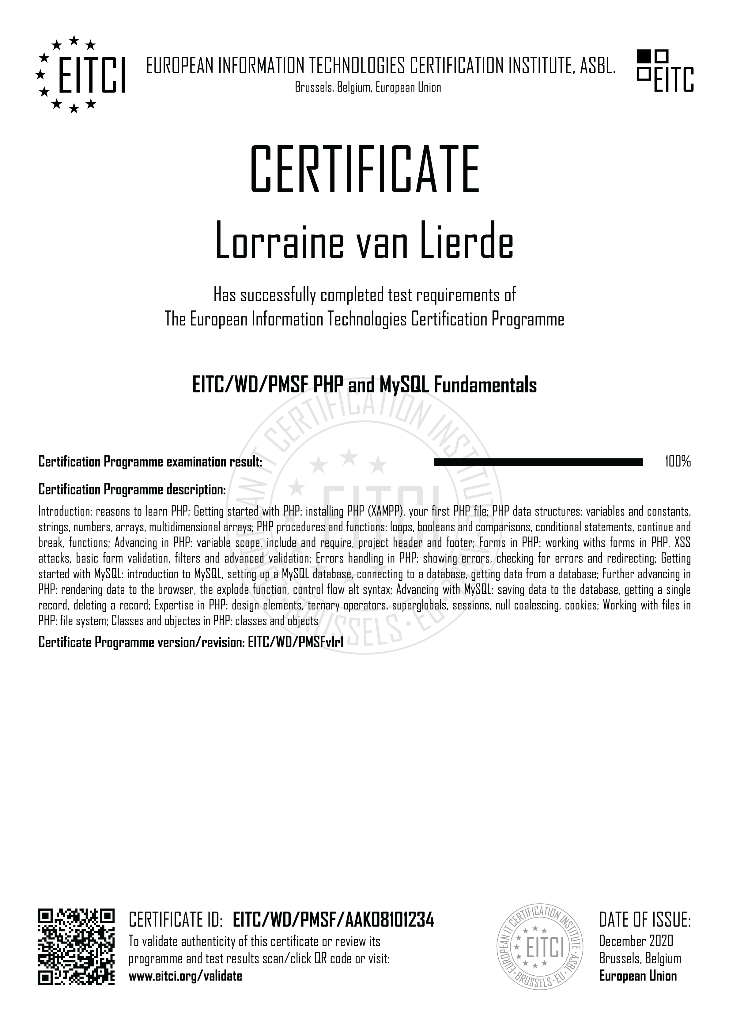 By enroling for the European Information Technologies Certification EITC/WD/PMSF PHP and MySQL Fundamentals you will have access to the complete didactic programme corresponding to the Certification Curriculum and the relevant examination procedure implemented fully remotely (with free additional retakes if required). Upon successful passing of the EITC/WD/PMSF examination a verifiable personalized EITC Certification will be issued in your name from Brussels under governance of the European Information Technologies Certification Institute EITCI, the accreditation and certification body for the programme. For all the details on the certification procedure please refer to How It Works section.
