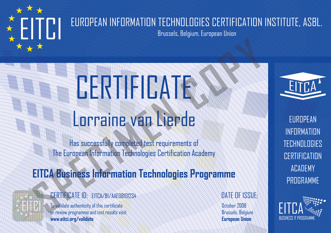 By enroling for the European Information Technologies Certification Academy: the EITCA/BI Business Information Technologies Academy you will have access to a complete didactic programme based on referenced materials organized in a step-by-step manner corresponding to the Certification Curriculum, including all the constituent EITC Certifications and their relevant examination procedures implemented fully remotely (with additional examination retakes if required, at no charge). Upon successful passing of the EITCA/BI all constituent EITC examinations a verifiable personalized EITCA/BI Certification (along with all the relevant EITCA/BI constituent EITC Certificates) will be issued in your name from Brussels under governance of the European Information Technologies Certification Institute, the accreditation and certification body for the programme. For the details on the certification procedure please refer to How It Works section.