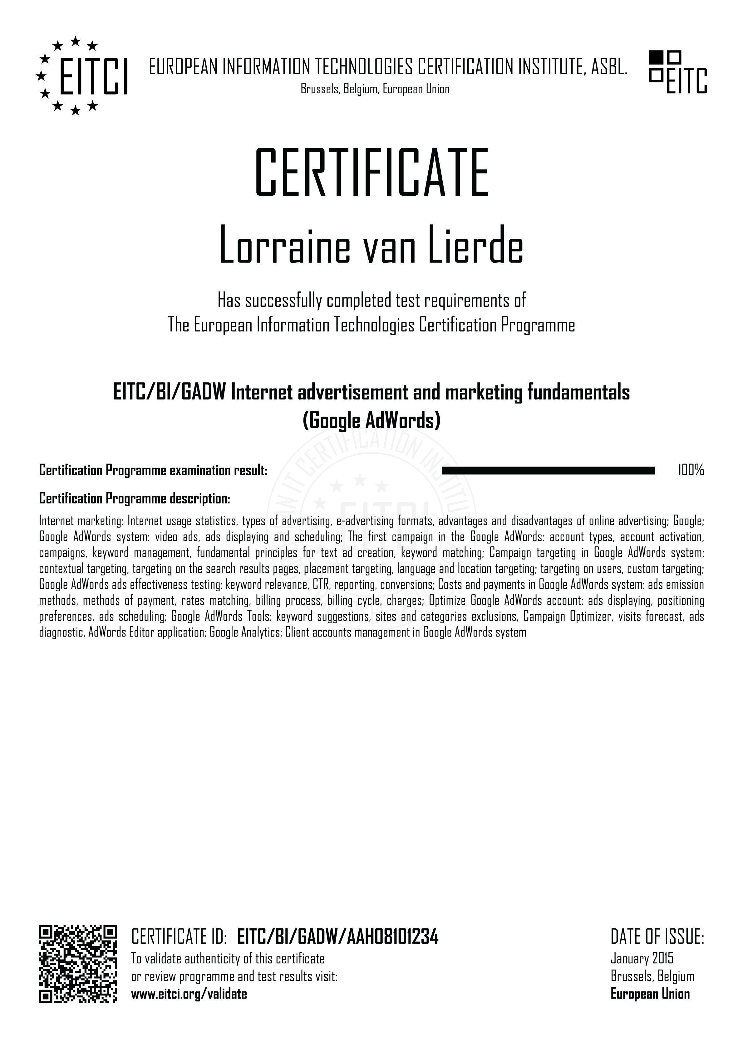 By enroling for the European Information Technologies Certification EITC/BI/GADW Internet advertisement and marketing fundamentals (Google AdWords) you will have access to the complete didactic programme corresponding to the Certification Curriculum and the relevant examination procedure implemented fully remotely (with free additional retakes if required). Upon successful passing of the EITC/BI/GADW examination a verifiable personalized EITC Certification will be issued in your name from Brussels under governance of the European Information Technologies Certification Institute EITCI, the accreditation and certification body for the programme. For all the details on the certification procedure please refer to How It Works section.