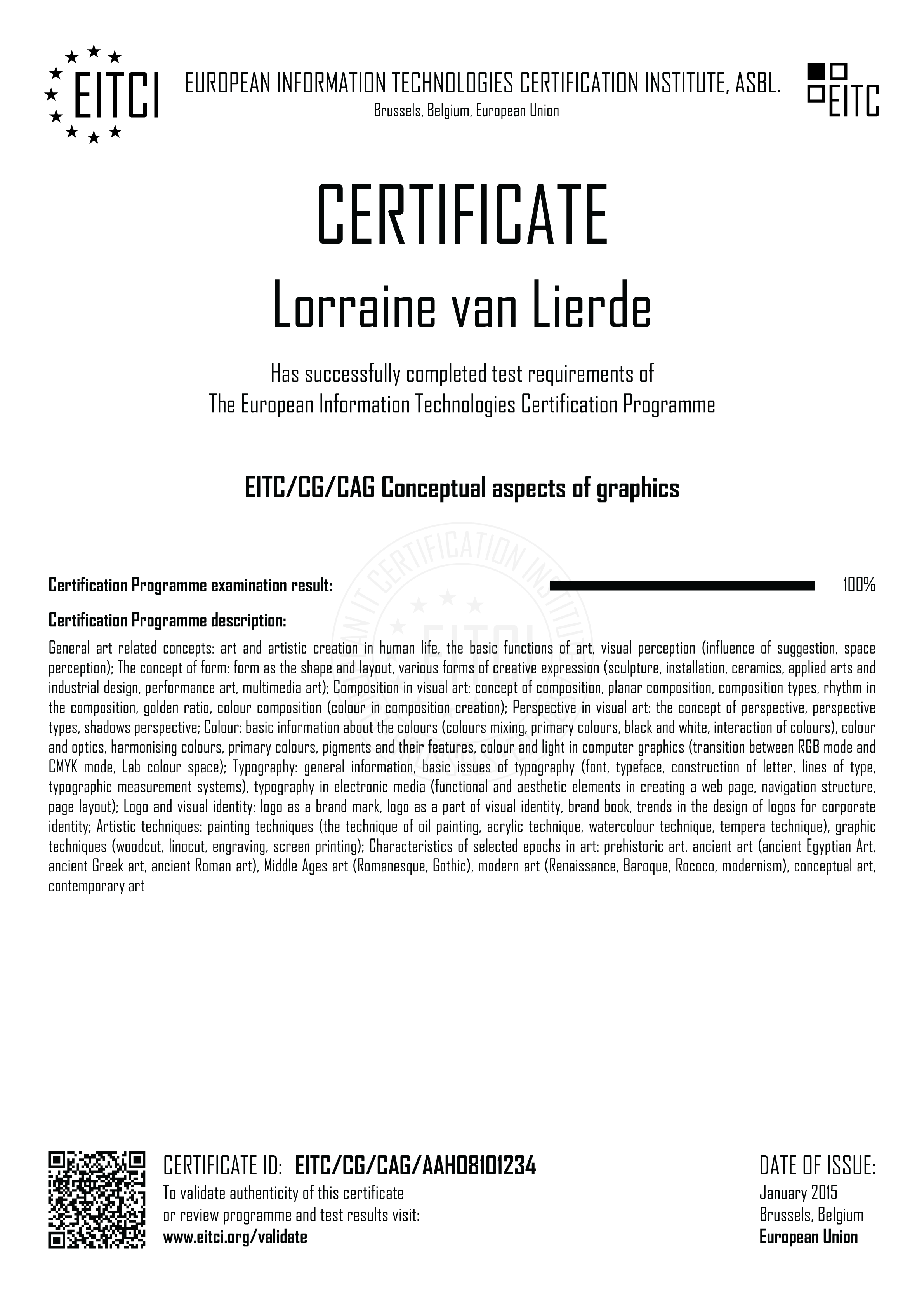 By enroling for the European Information Technologies Certification EITC/CG/CAG Conceptual aspects of graphics you will have access to the complete didactic programme corresponding to the Certification Curriculum and the relevant examination procedure implemented fully remotely (with free additional retakes if required). Upon successful passing of the EITC/CG/CAG examination a verifiable personalized EITC Certification will be issued in your name from Brussels under governance of the European Information Technologies Certification Institute EITCI, the accreditation and certification body for the programme. For all the details on the certification procedure please refer to How It Works section.
