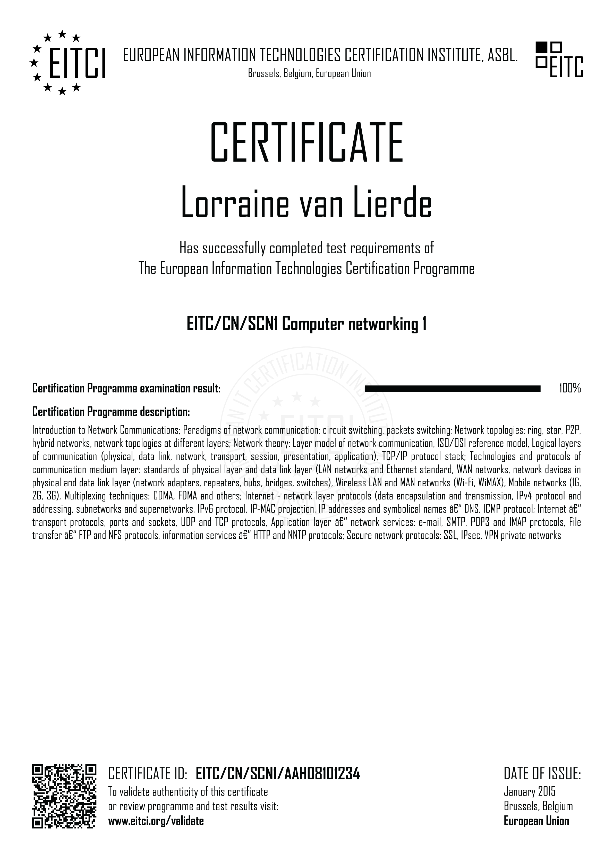 By enroling for the European Information Technologies Certification EITC/CN/SCN1 Computer networking 1 you will have access to the complete didactic programme corresponding to the Certification Curriculum and the relevant examination procedure implemented fully remotely (with free additional retakes if required). Upon successful passing of the EITC/CN/SCN1 examination a verifiable personalized EITC Certification will be issued in your name from Brussels under governance of the European Information Technologies Certification Institute EITCI, the accreditation and certification body for the programme. For all the details on the certification procedure please refer to How It Works section.