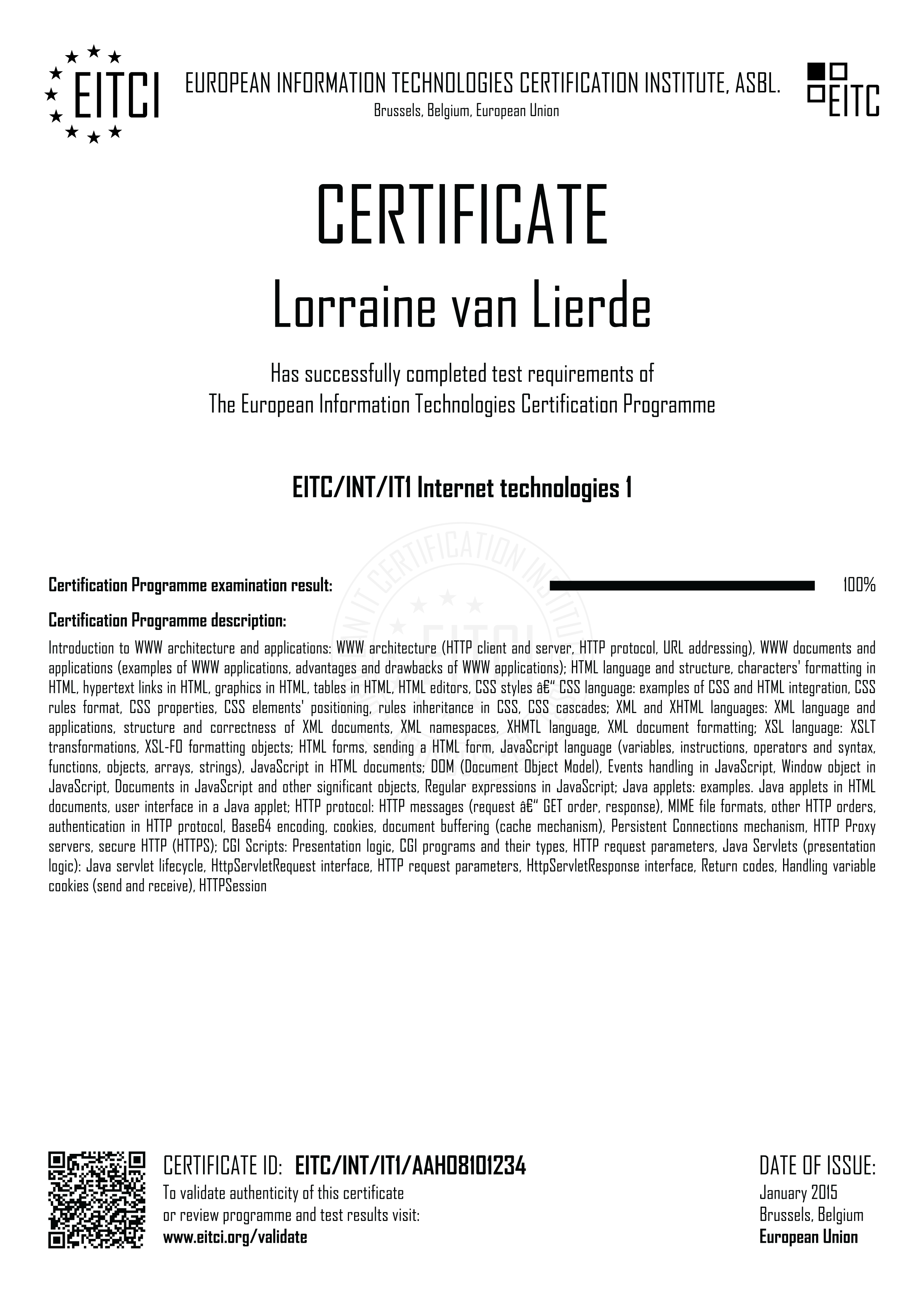 By enroling for the European Information Technologies Certification EITC/INT/IT1 Internet technologies 1 you will have access to the complete didactic programme corresponding to the Certification Curriculum and the relevant examination procedure implemented fully remotely (with free additional retakes if required). Upon successful passing of the EITC/INT/IT1 examination a verifiable personalized EITC Certification will be issued in your name from Brussels under governance of the European Information Technologies Certification Institute EITCI, the accreditation and certification body for the programme. For all the details on the certification procedure please refer to How It Works section.