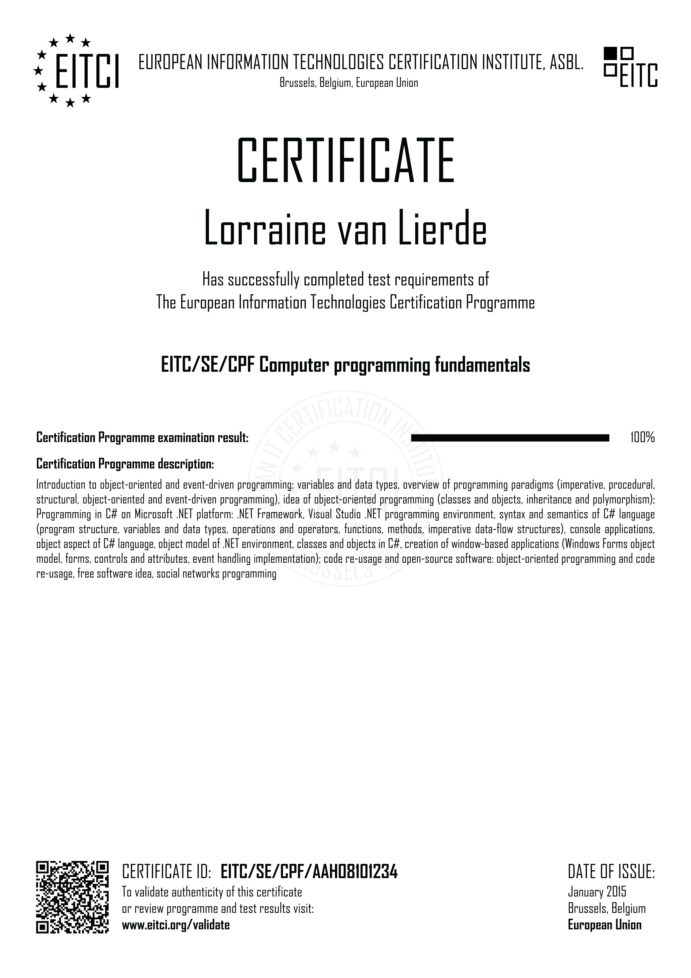 By enroling for the European Information Technologies Certification EITC/SE/CPF Computer programming fundamentals you will have access to the complete didactic programme corresponding to the Certification Curriculum and the relevant examination procedure implemented fully remotely (with free additional retakes if required). Upon successful passing of the EITC/SE/CPF examination a verifiable personalized EITC Certification will be issued in your name from Brussels under governance of the European Information Technologies Certification Institute EITCI, the accreditation and certification body for the programme. For all the details on the certification procedure please refer to How It Works section.