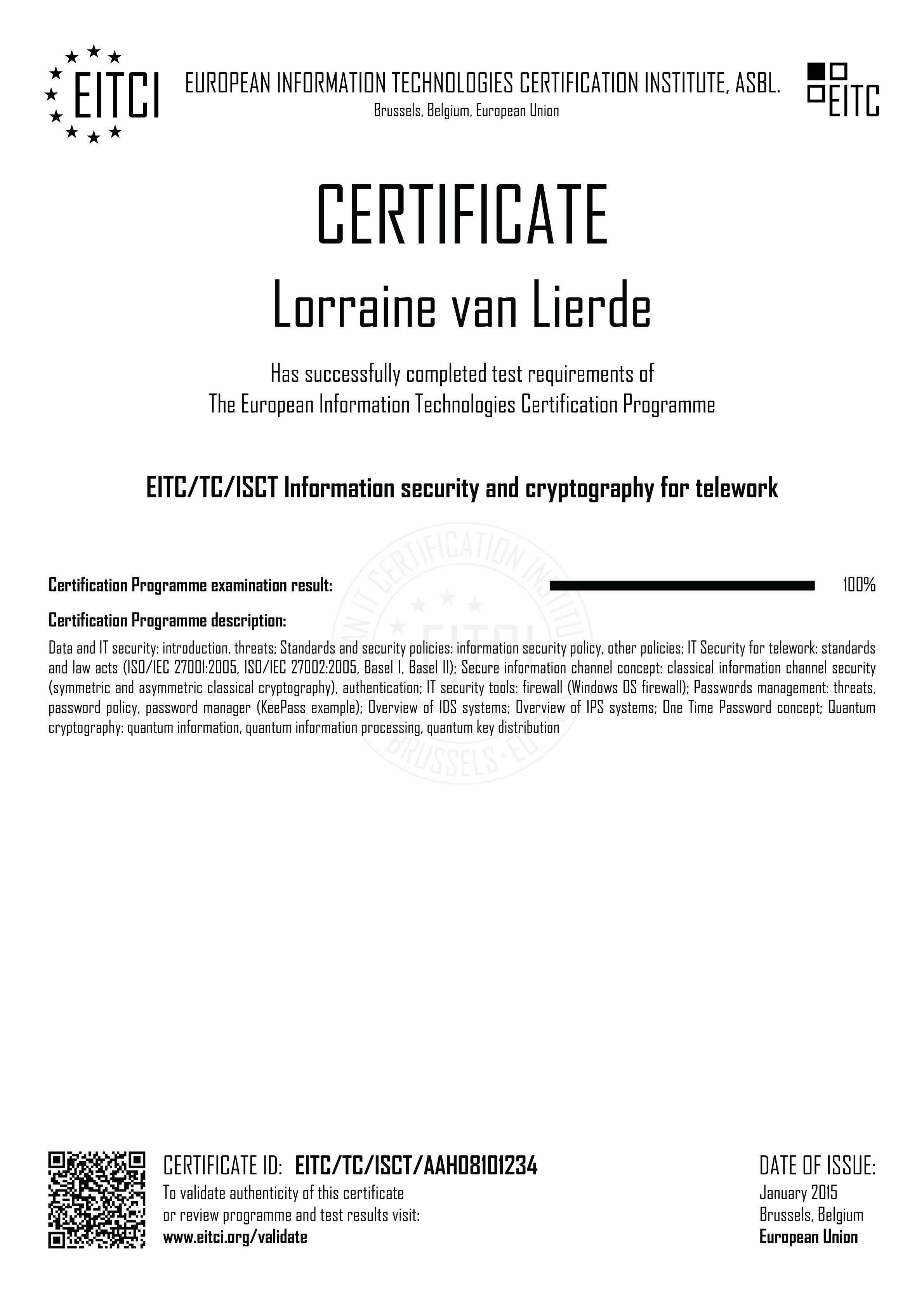 By enroling for the European Information Technologies Certification EITC/TC/ISCT Information security and cryptography for telework you will have access to the complete didactic programme corresponding to the Certification Curriculum and the relevant examination procedure implemented fully remotely (with free additional retakes if required). Upon successful passing of the EITC/TC/ISCT examination a verifiable personalized EITC Certification will be issued in your name from Brussels under governance of the European Information Technologies Certification Institute EITCI, the accreditation and certification body for the programme. For all the details on the certification procedure please refer to How It Works section.